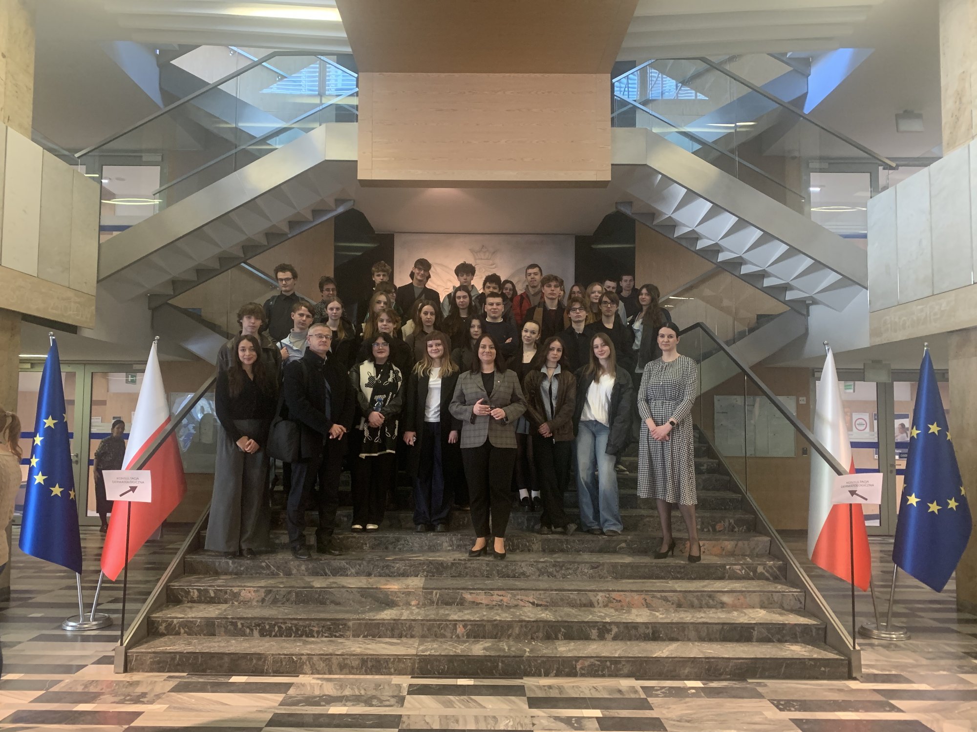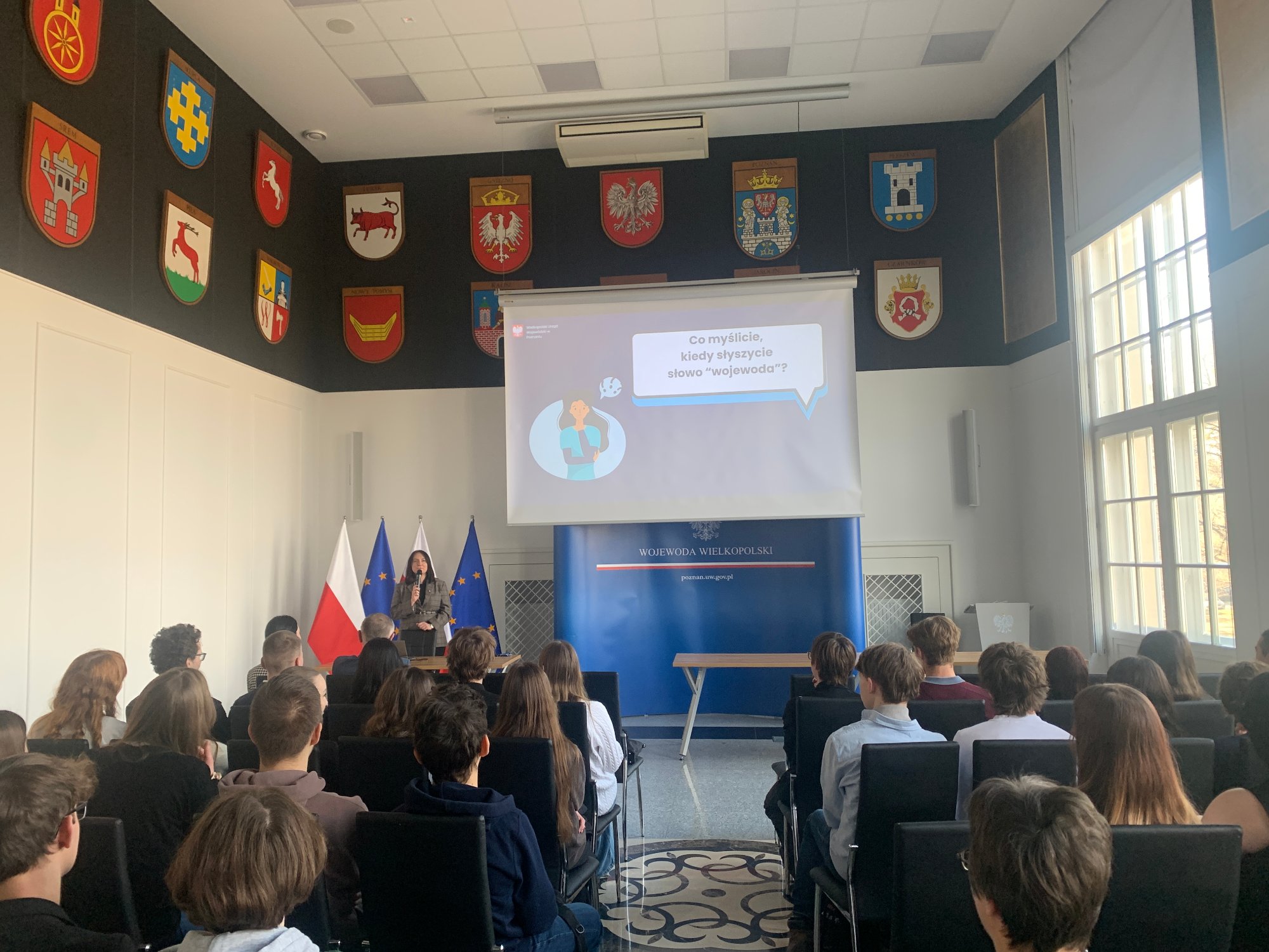 7 marca uczniowie klasy III A oraz grupa uczniów klasy II A udali się na spotkanie z p. Karoliną Fabiś-Szulc I Wicewojewodą Wielkopolską. Było to kolejne wyjście - przypomnijmy wcześniej uczestniczyli w posiedzeniu Rady Miasta Poznania oraz spotkali się z p. Mariuszem Wiśniewskim Zastępcą Prezydenta Miasta Poznania) zainicjowane przez p. Justynę Kuberkę Radną Miasta Poznania. Tym razem uczniowie mogli zapoznać się z funkcjonowaniem administracji państwowej w naszym województwie, w tym zadaniami stojącymi przed wojewodą.