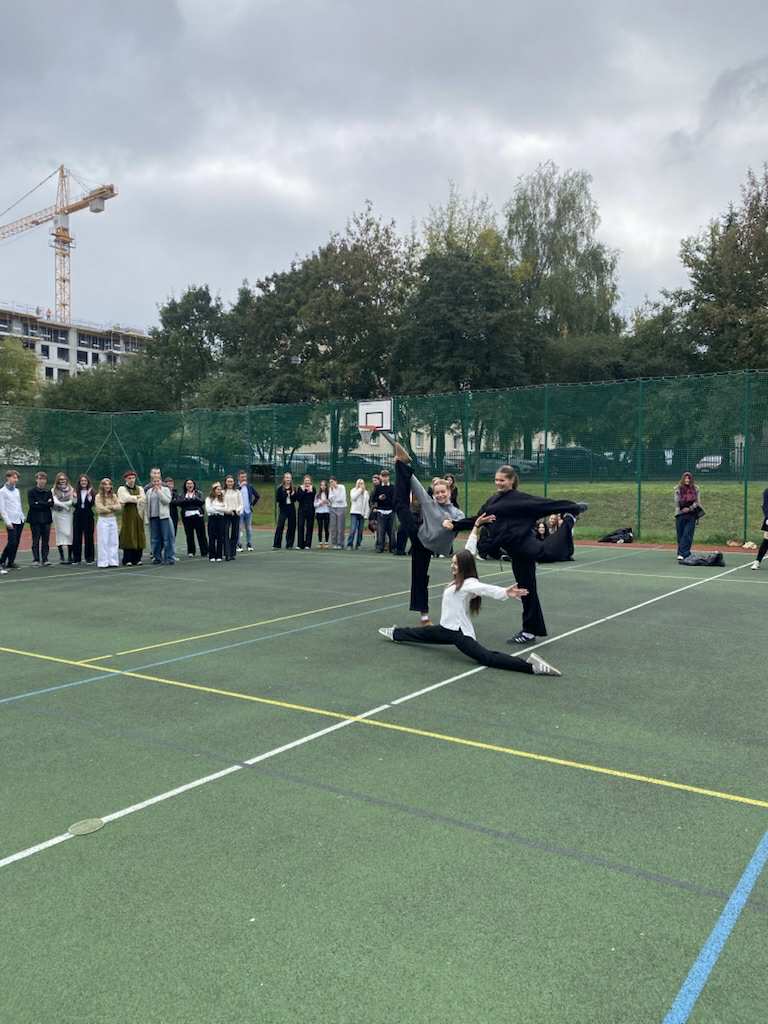 Potem w oficjalnej części, w obecności Dyrekcji oraz całej społeczności Dąbrówki, klasy pierwsze wraz ze wstępną, złożyły ślubowanie na sztandar szkoły. Zabrzmiał też hymn VII LO… i dalej było muzycznie, ale już nieoficjalnie… Młodzież i nauczyciele ustawili się w dwa duże koła i odtańczyli słynną belgijkę. Po tej rozgrzewce wszyscy udali się do klas brać udział w rozmaitych konkurencjach… rozwiązywać testy, wymyślać memy, hasła promujące klasę, szkołę, tworzyć herby, mapy, pocztówki, kielichy, ozdoby, prezentować przygotowane wcześniej stroje Dąbrówki, trudne wyzwania sportowe oraz tańce średniowieczne przy wtórze współczesnej muzyki… W tym czasie jedna z Komisji przyznawała punkty za - stylizowane na czasy Dąbrówki - ciasta, które cieszyły podniebienie i oko… Całe szczęście młodzież szybko zgłosiła się po nie i zabrała do zjedzenia…