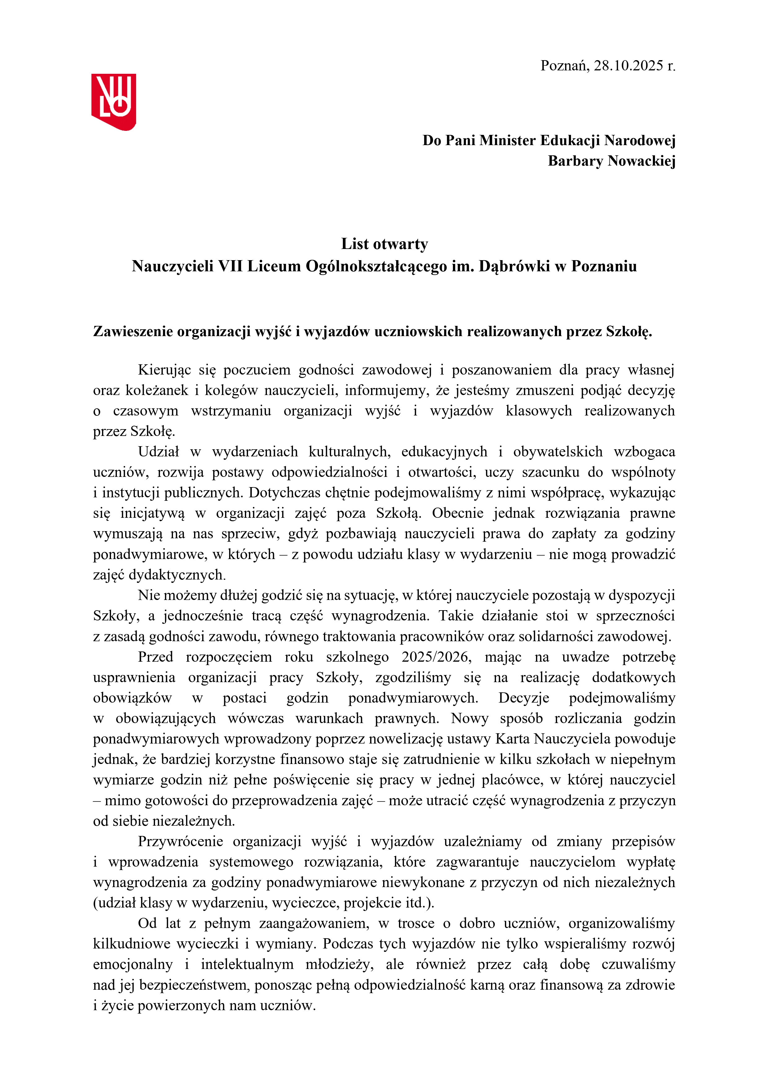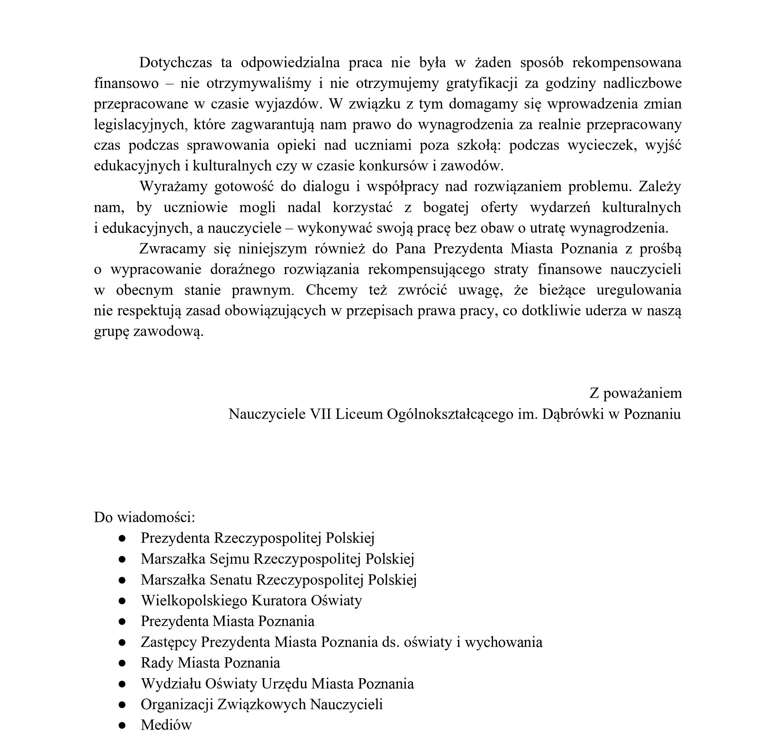List otwarty Nauczycieli VII Liceum Ogólnokształcącego im. Dąbrówki w Poznaniu