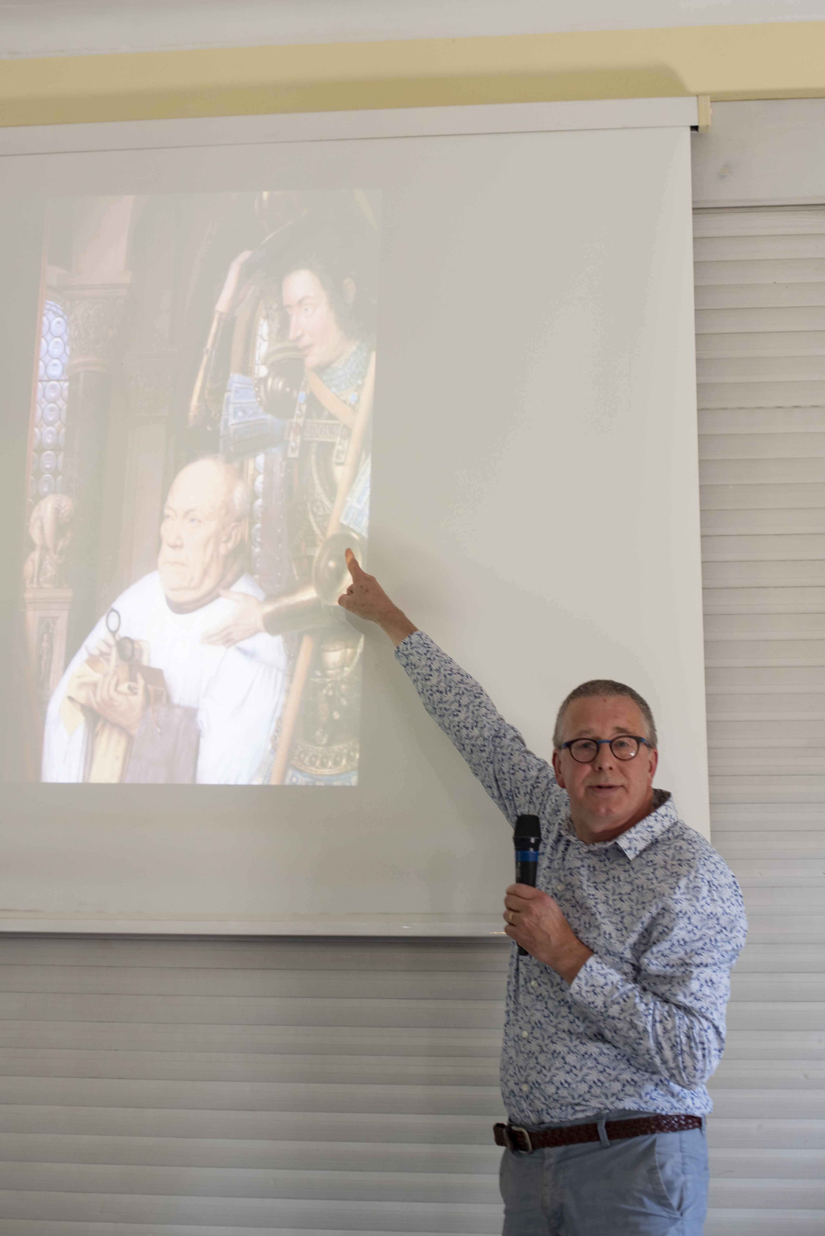 Podczas prelekcji Diederik De Beir pokazał ciekawe szczegóły poliptyku Van Eycka, potwierdził jego nowatorskie, rewolucyjne sposoby tworzenia i głębokie, symboliczne treści... Zaprezentował oryginalne brzmienia haiku w różnych językach, ich tłumaczenia, ale i samych twórców. Podzielił się swoimi doświadczeniami poetyckimi, polecił uważne przyglądanie się przyrodzie. Poprosił żonę (Polkę), z którą przyjechał, o odczytanie wierszy, które napisali wcześniej nasi uczniowie, zachęcił, by dalej tworzyć... Swą książkę zostawił w bibliotece.