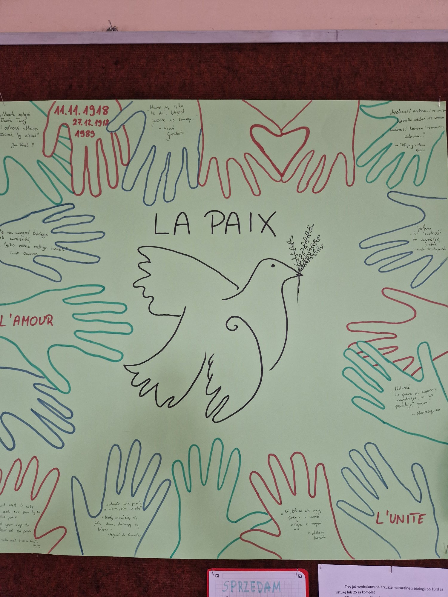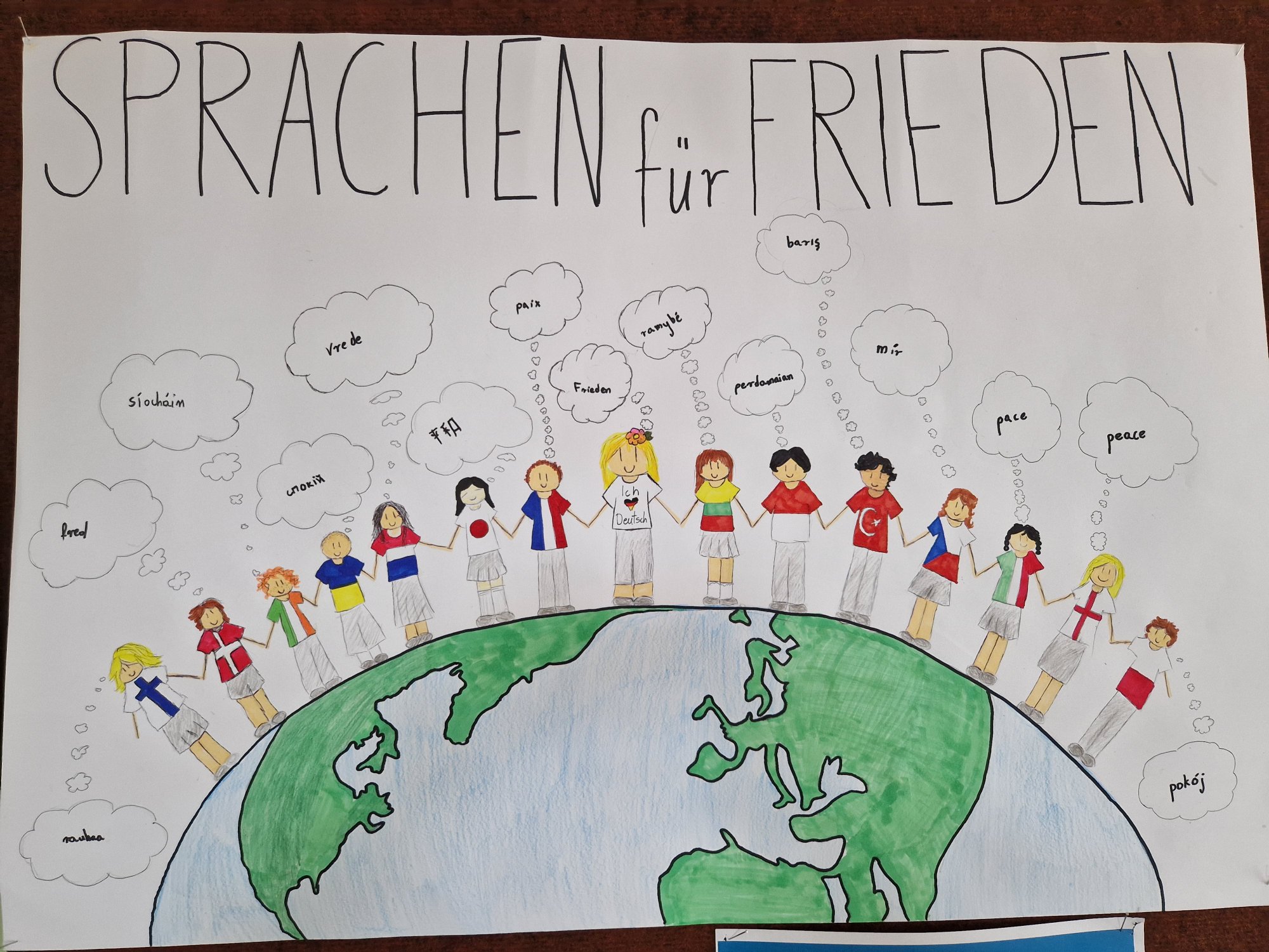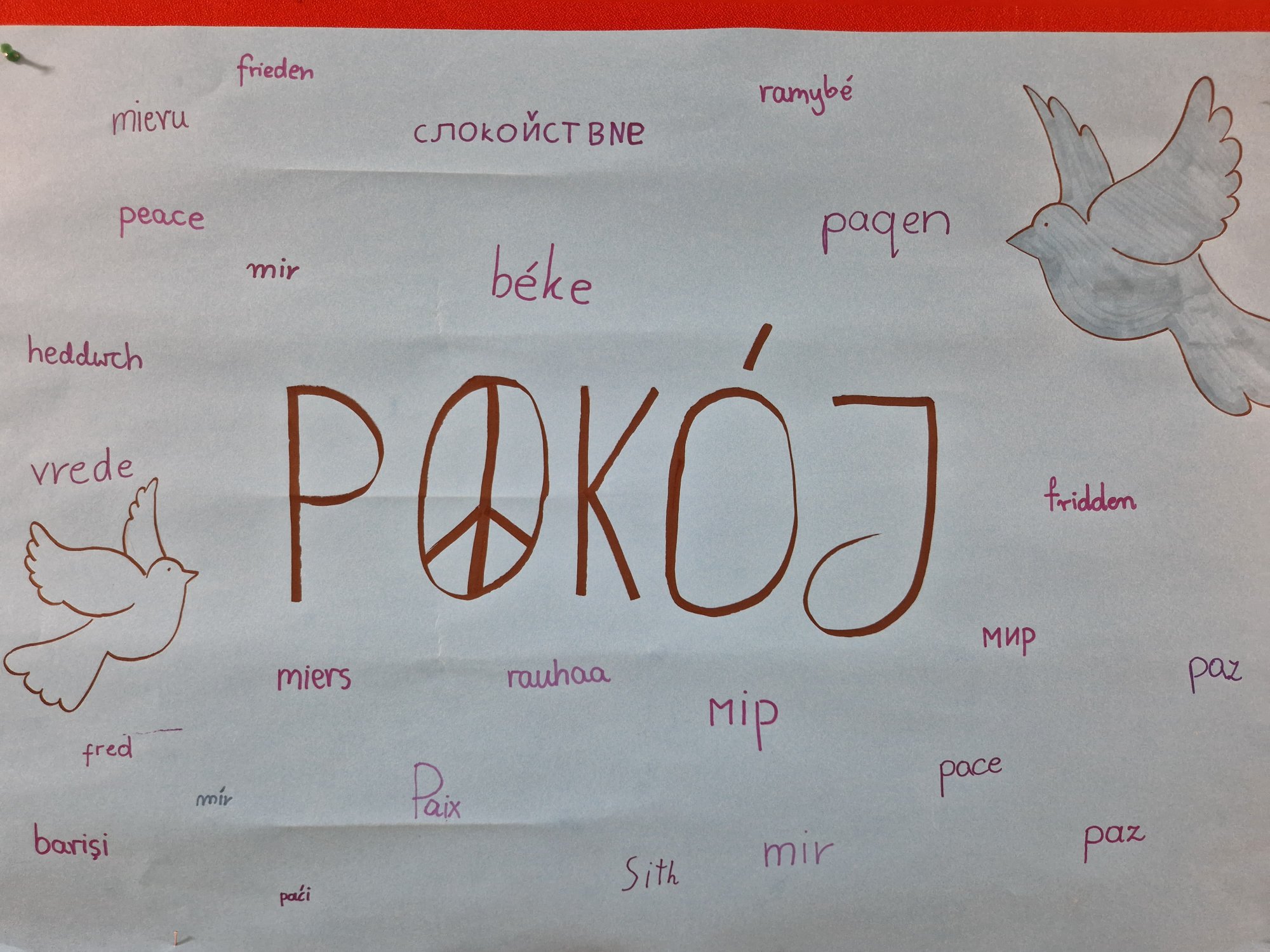 Piękne kolorowe prace artystyczne uczniów w temacie "Języki i pokój" oraz "Jedność i Pokój" na zakończenie Europejskiego Dnia Języków. Zadanie dla dociekliwych: w ilu językach pojawia się na nich słowo "pokój"?...