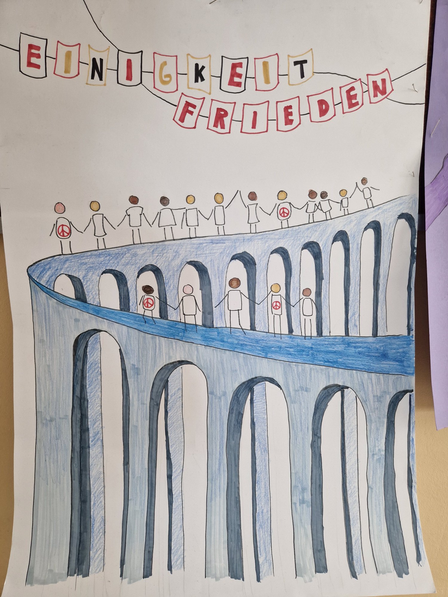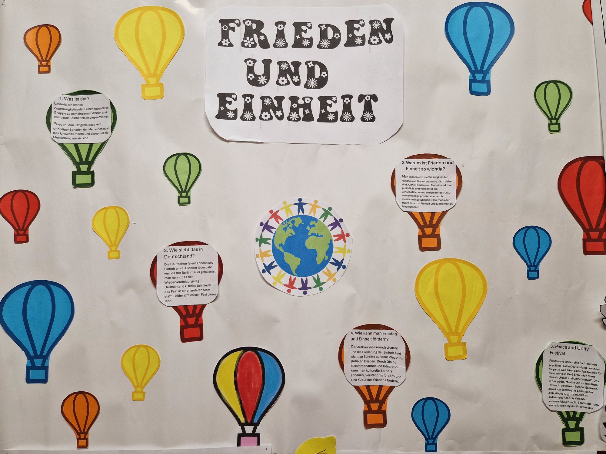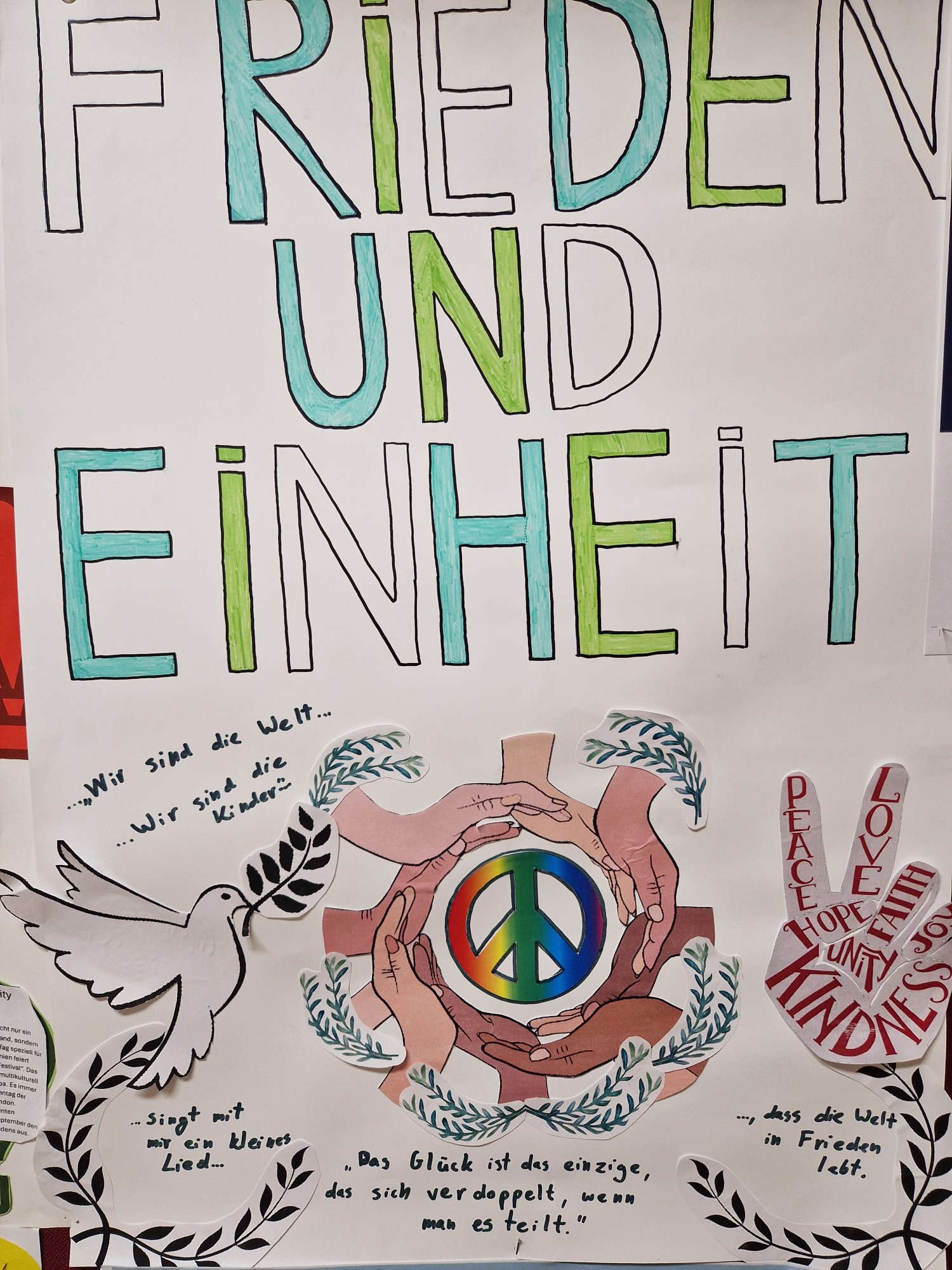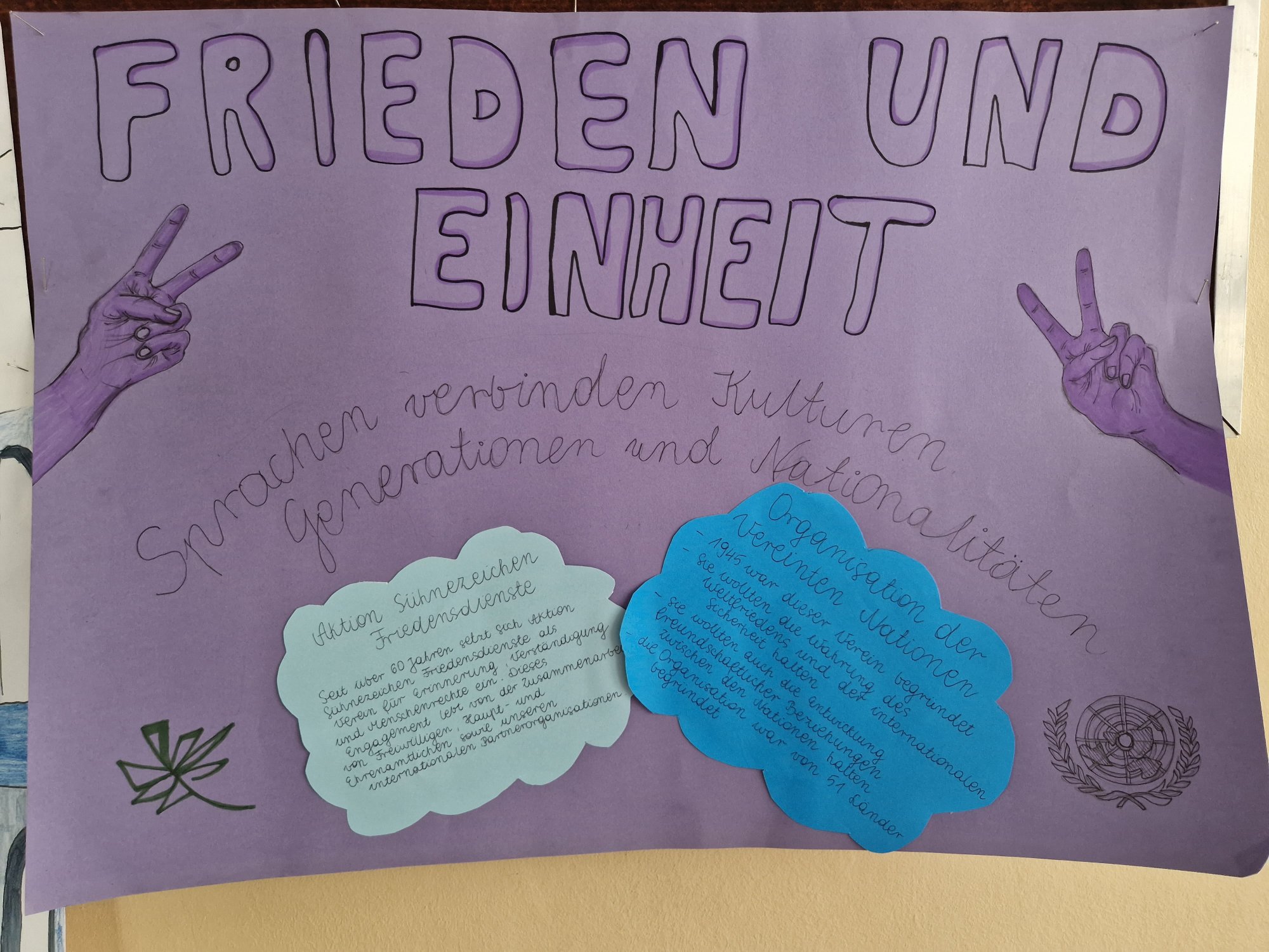 Piękne kolorowe prace artystyczne uczniów w temacie "Języki i pokój" oraz "Jedność i Pokój" na zakończenie Europejskiego Dnia Języków. Zadanie dla dociekliwych: w ilu językach pojawia się na nich słowo "pokój"?...