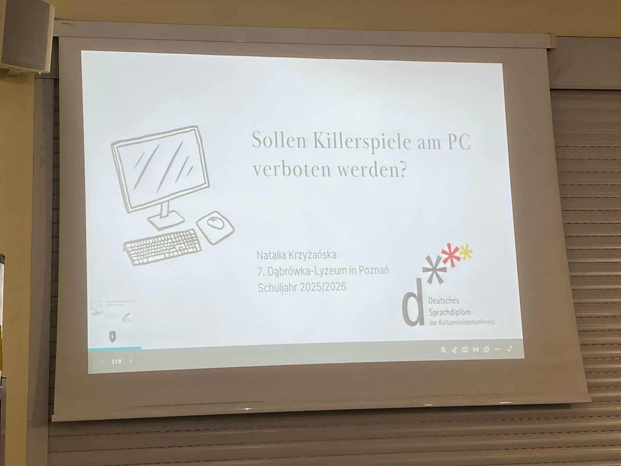 Naszą szkołę z ogromnym zaangażowaniem reprezentowała Natalia Krzyżańska z klasy 3e. W pierwszej części egzaminu omówiła temat „Großstadtleben”, a w drugiej zaprezentowała przygotowaną przez siebie prezentację na temat „Sollen Killerspiele am PC verboten werden?”. Choć do właściwego egzaminu DSD II Natalia przystąpi dopiero w przyszłym roku, już teraz zdobyła cenne doświadczenie i pokazała swoje wysokie kompetencje językowe.