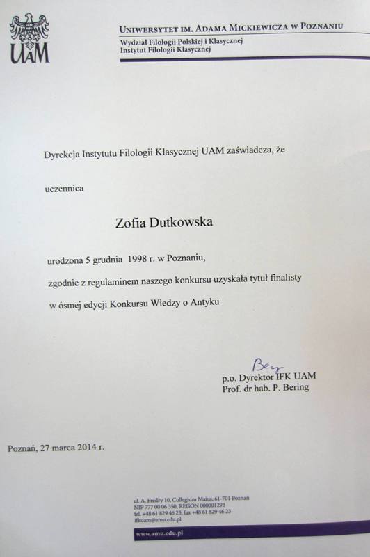 27 marca 2014r. w Instytucie Filologii Klasycznej Uniwersytetu im. Adama Mickiewicza w Poznaniu odbył się finał VIII Konkursu Wiedzy o Antyku dla uczniów gimnazjów i liceów.