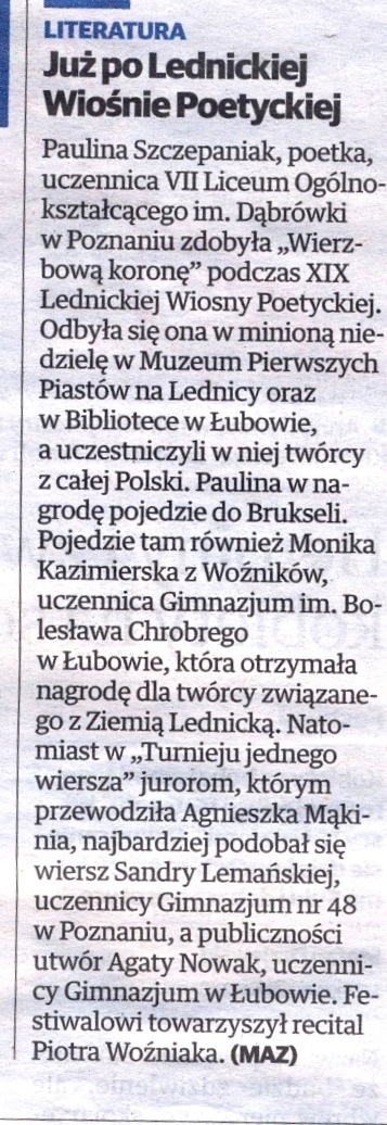 Dziękuję Klaudii Lesińskiej ( 2B), i Antoniemu Wolińskiemu (2E), którzy zdecydowali się po raz kolejny wziąć udział w konkursie poetyckim.