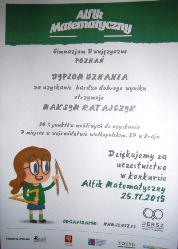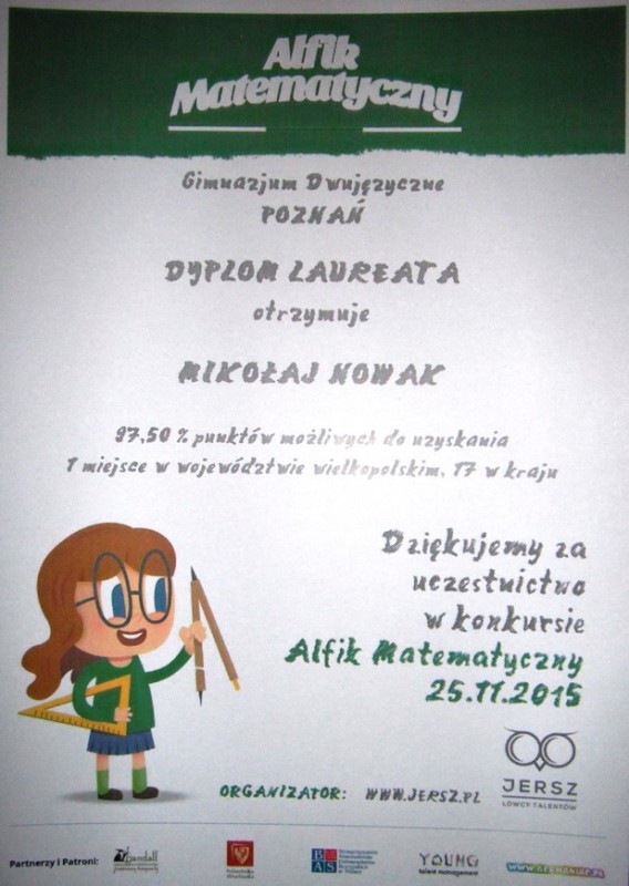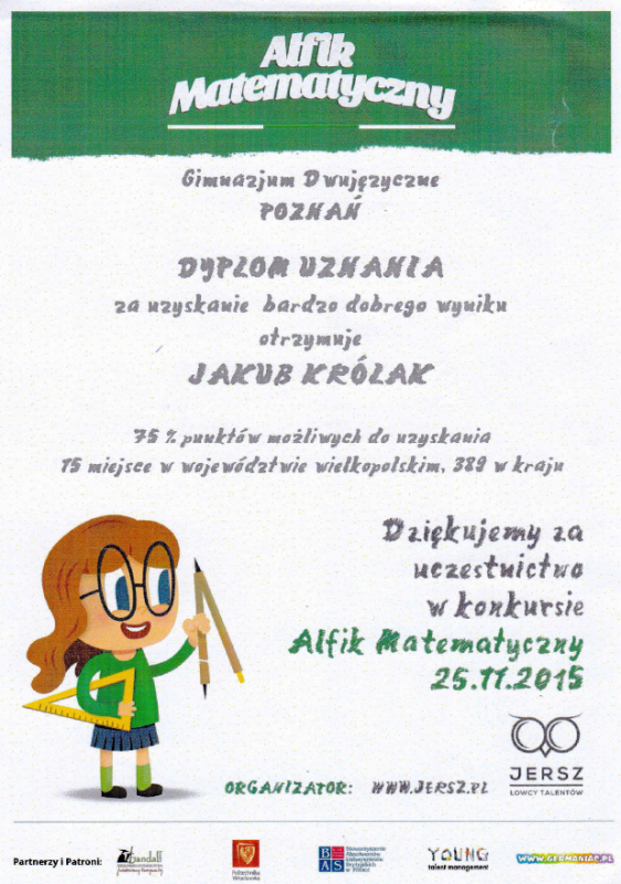 Mikołaj Nowak, uczeń klasy 1ga, został laureatem konkursu „Alfik Matematyczny”, zajmując przy tym 1 miejsce w województwie wielkopolskim i jednocześnie 17 w kraju. Wynik „bardzo dobry” w tym konkursie osiągnęli: Maksym Ratajczyk (1ga), Jan Bartkowiak (1ga) i Jakub Królak (2gb), zajmując odpowiednio 7, 12 i 15 miejsce w województwie wielkopolskim.