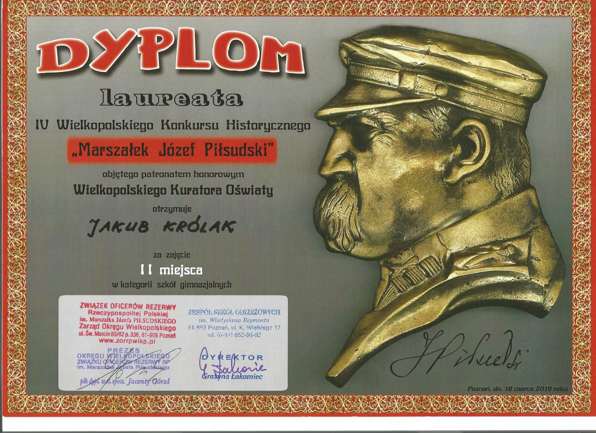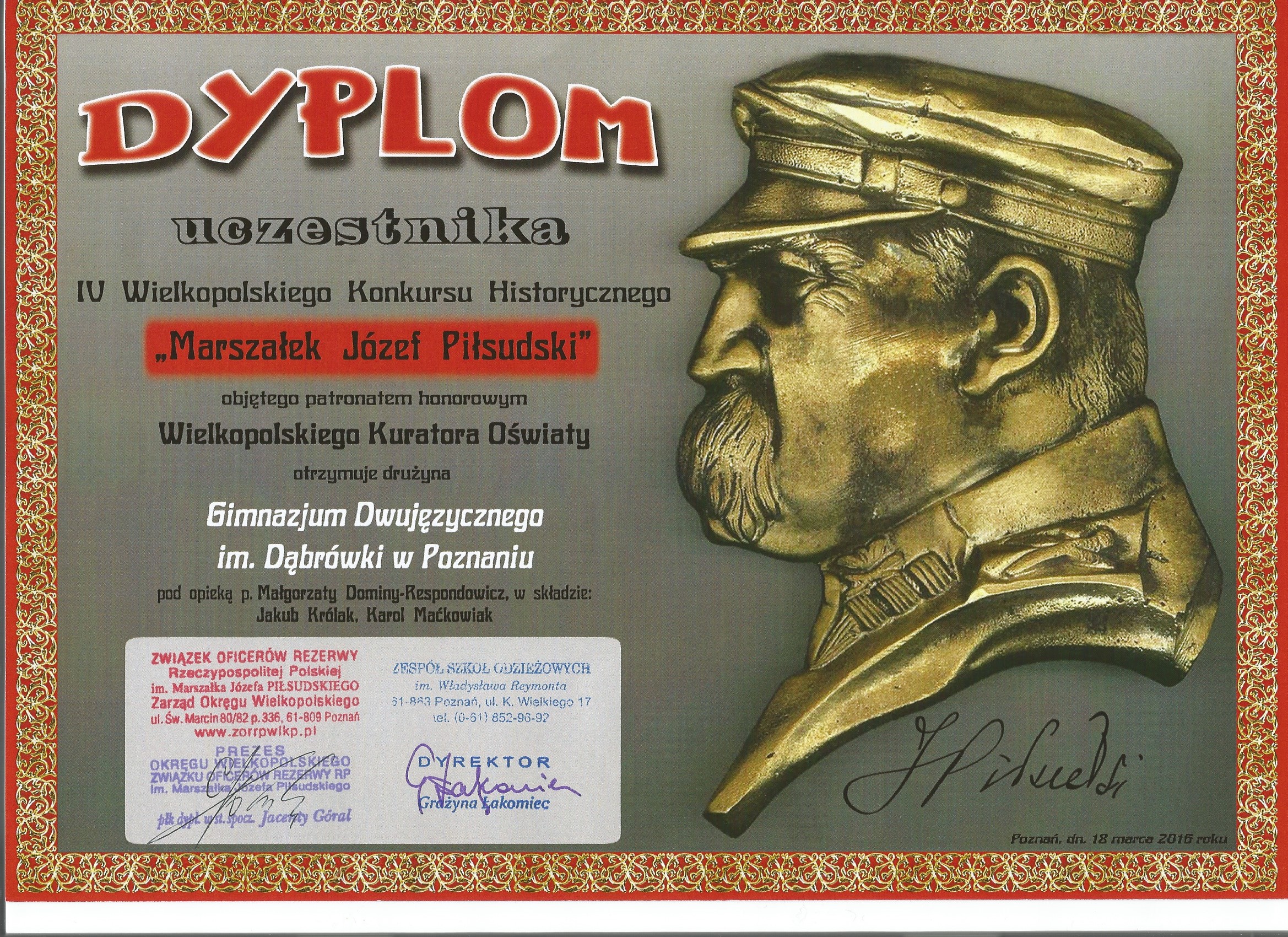 Z dumą i radością informujemy, że nasi uczniowie Jakub Królak i Karol Maćkowiak z klasy 2GB zajęli II miejsce w IV Wielkopolskim Konkursie Historycznym „Marszałek Józef Piłsudski” – w grupie wiekowej szkół gimnazjalnych województwa wielkopolskiego.