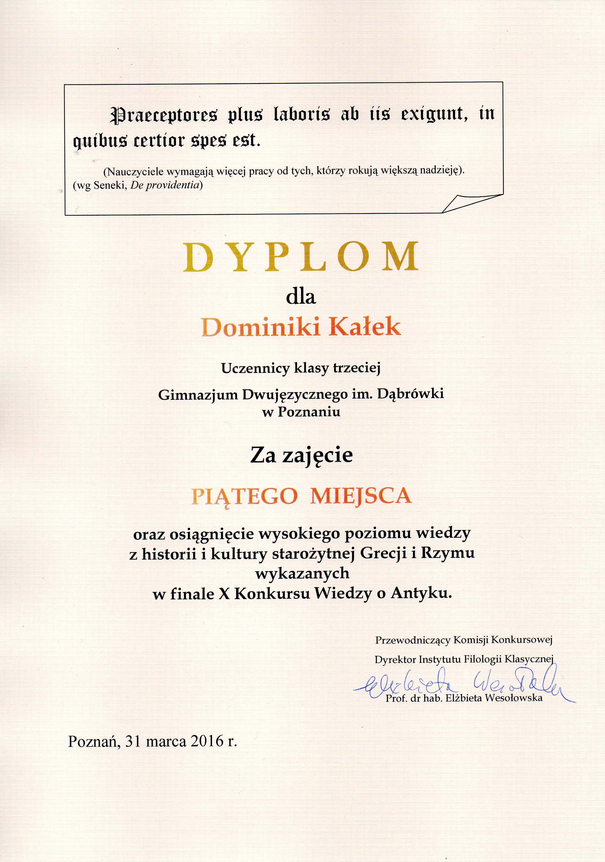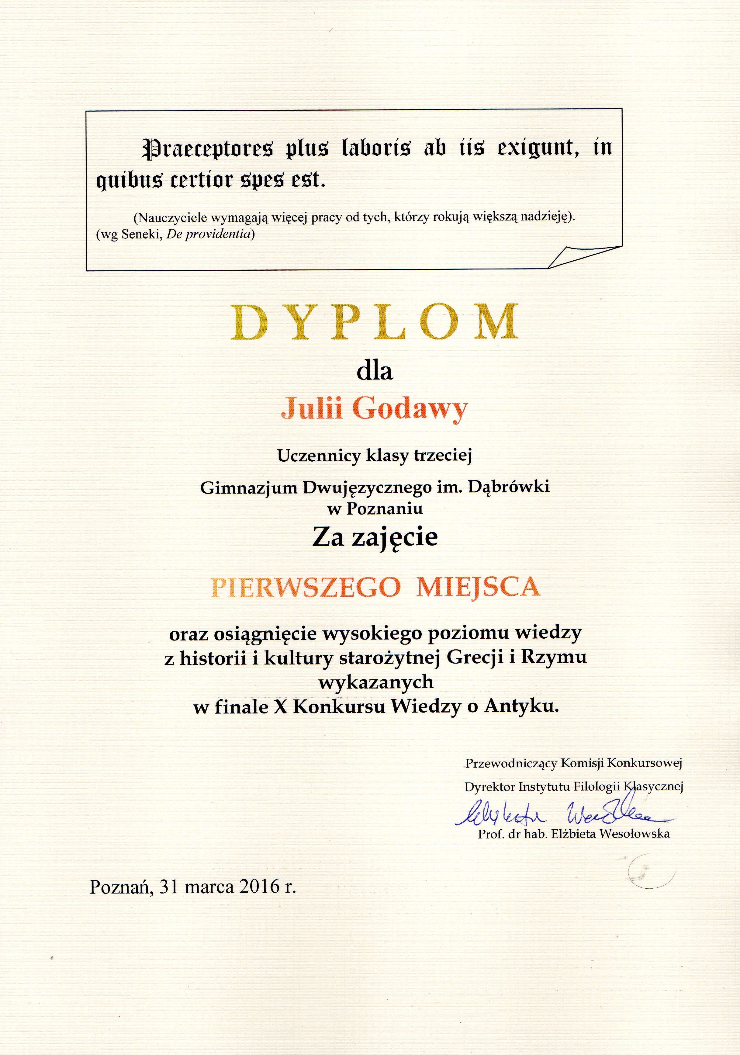 31 marca 2016 roku w Instytucie Filologii Klasycznej Uniwersytetu im. Adama Mickiewicza w Poznaniu odbył się finał X Konkursu Wiedzy o Antyku dla 47 uczniów gimnazjów i 19 uczniów liceów.