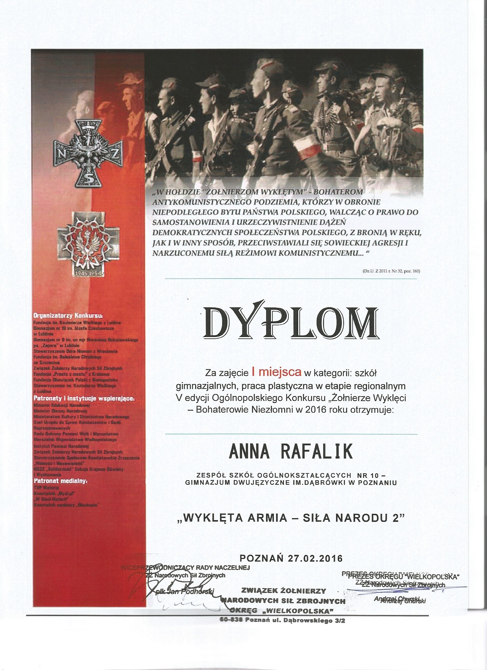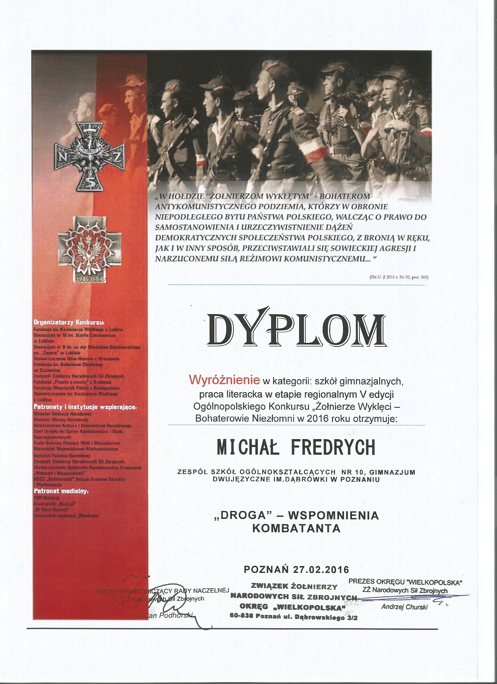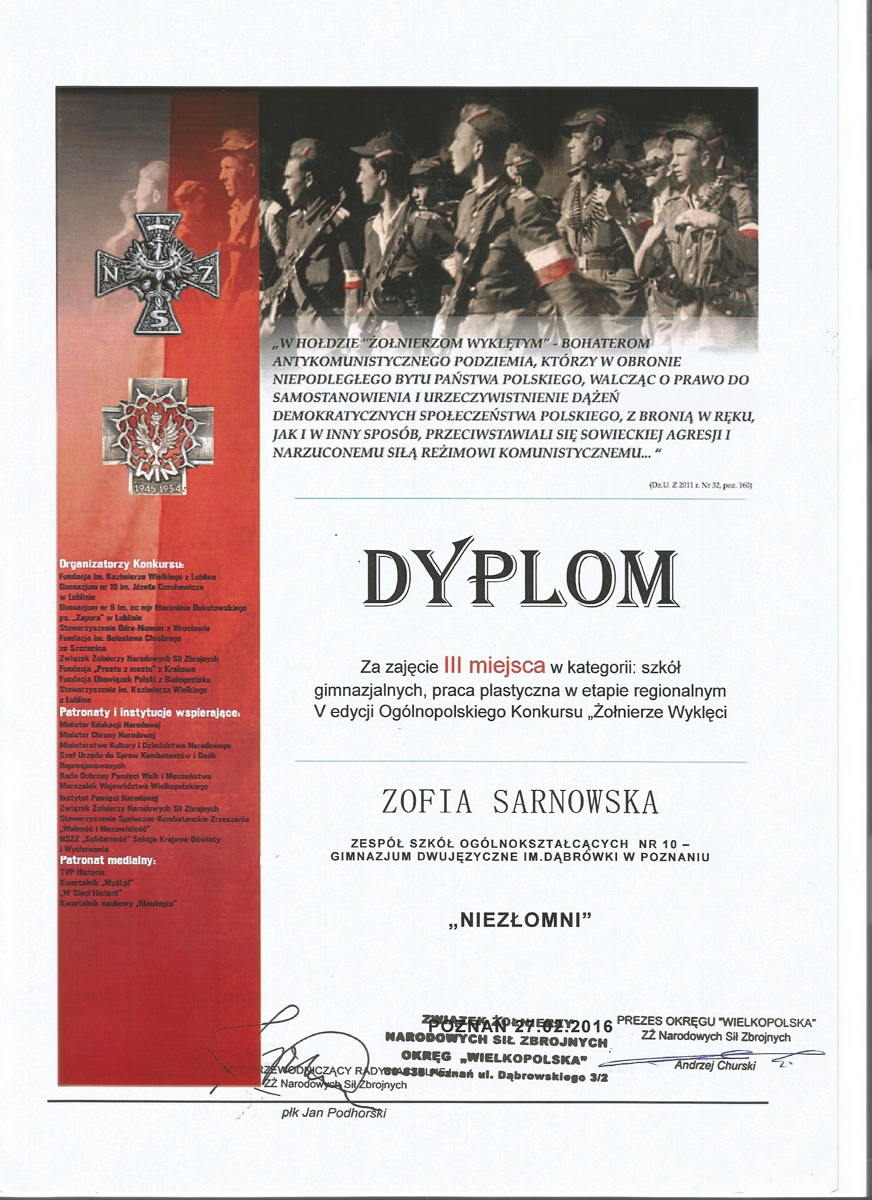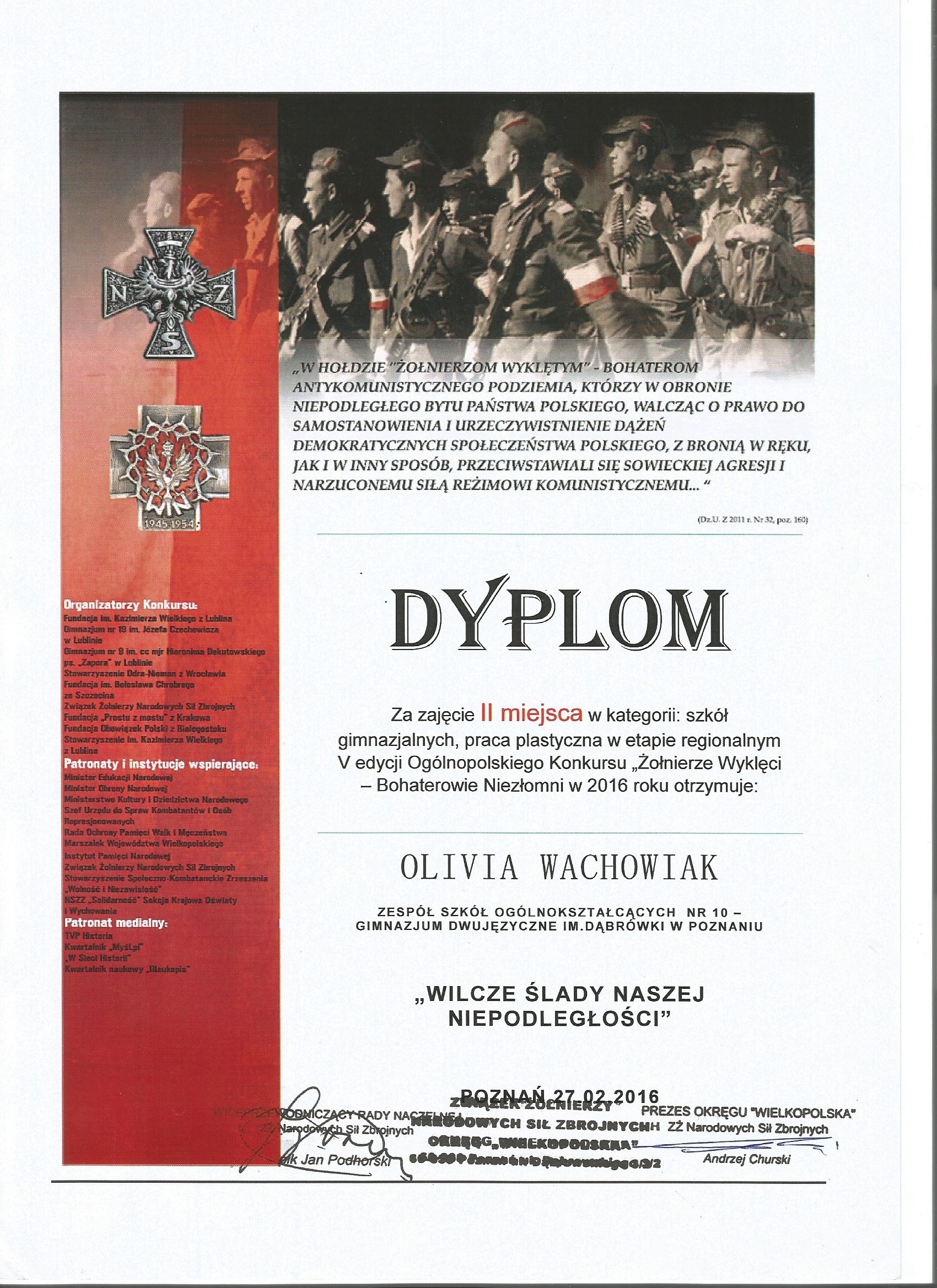 W sobotę 27 lutego 2016 r. w Wielkopolskim Urzędzie Wojewódzkim w Poznaniu odbyło się uroczyste wręczenie dyplomów i nagród laureatom I Etapu V Ogólnopolskiego Konkursu „Żołnierze Wyklęci – Bohaterowie Niezłomni”.