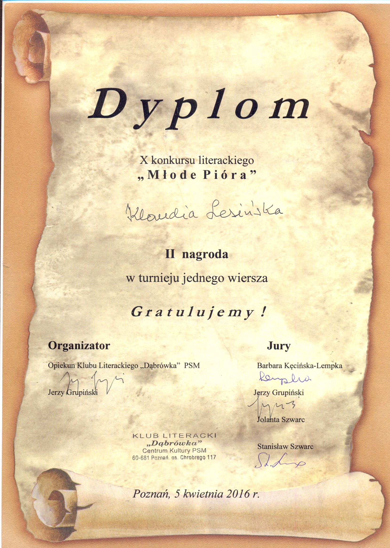 zajęła II miejsce w konkursie jednego wiersza „Młodych Piór.