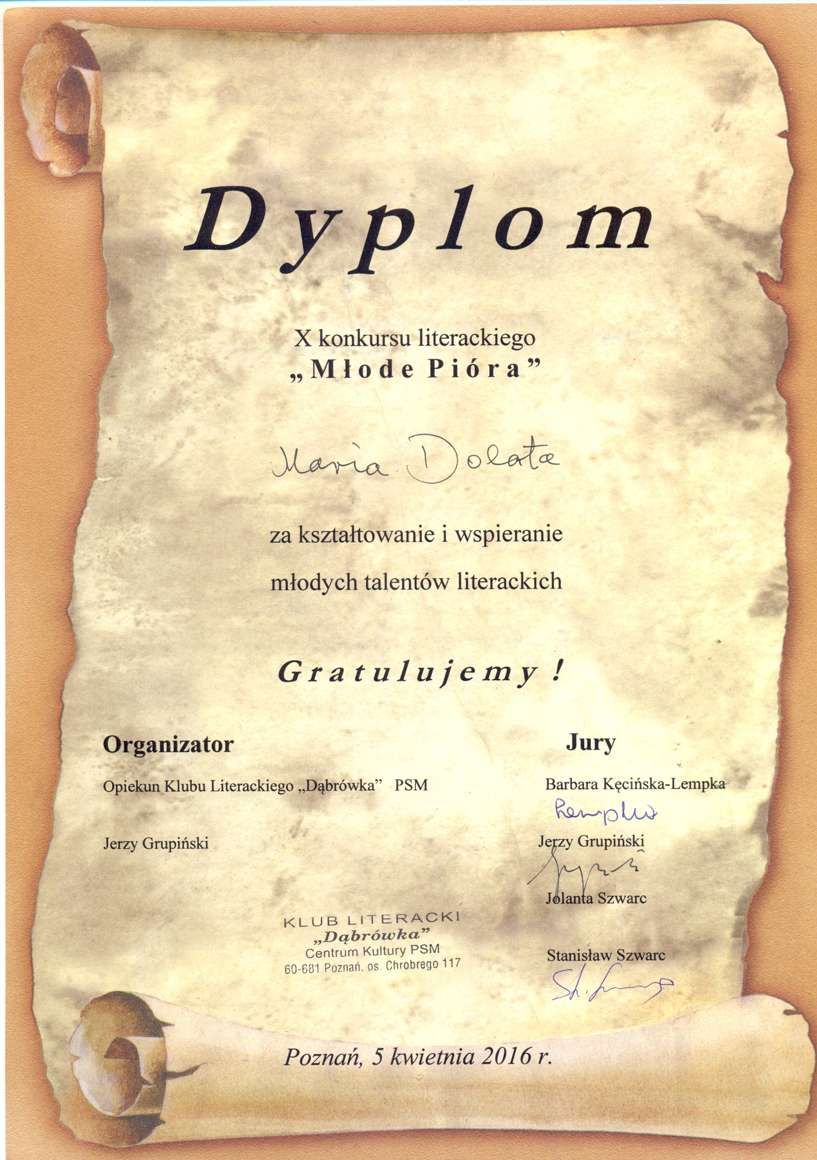 którego opiekunem jest znany poznański poeta Jerzy Grupiński.