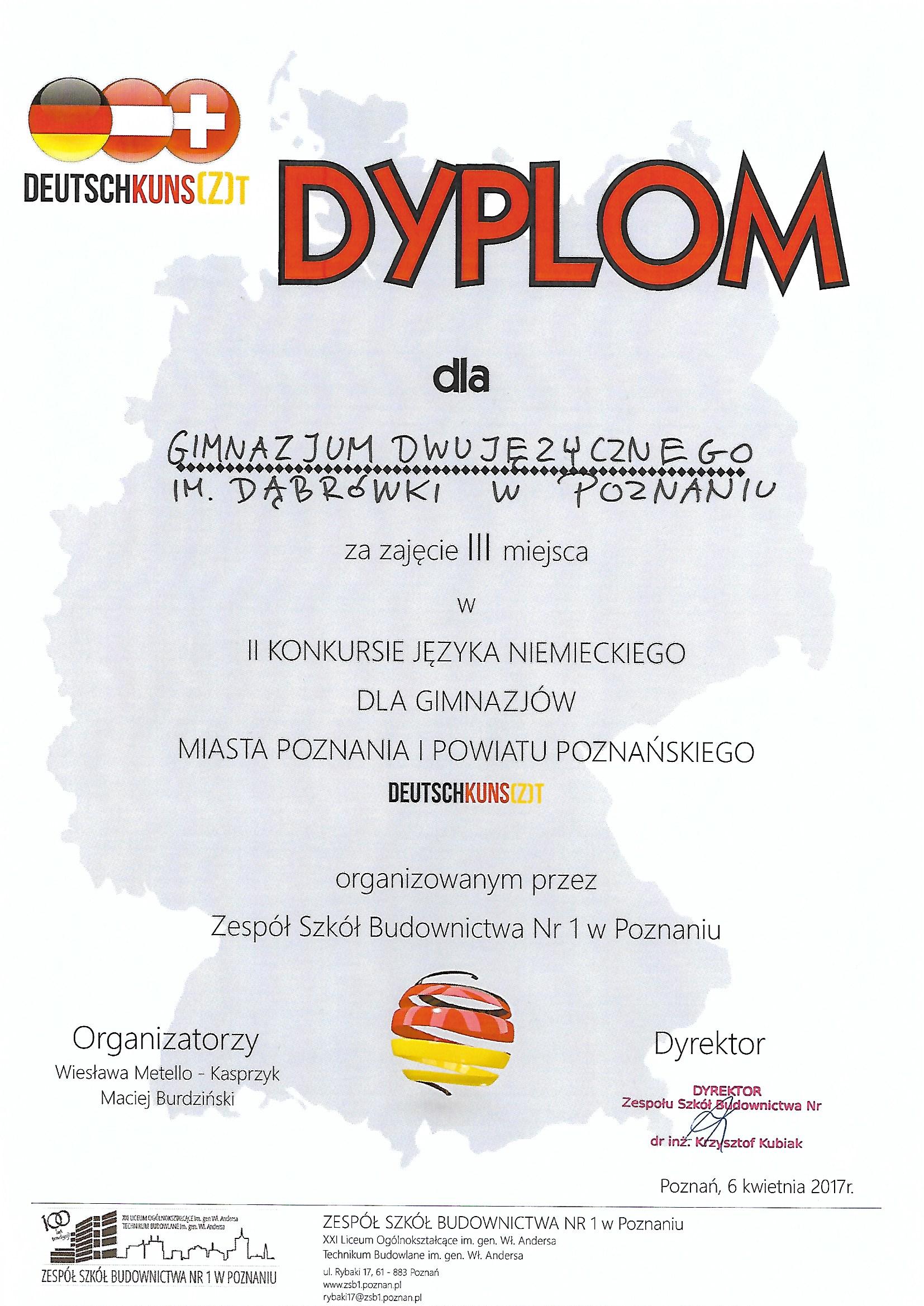 Uczniowie klasy 2GA – Sophie Williams, Mateusz Banaszewski i Krzysztof Drobnik wzięli udział w II Konkursie Języka Niemieckiego dla Gimnazjów Miasta Poznania i Powiatu Poznańskiego „Deutschkuns(z)t”, organizowanym przez Zespół Szkół Budownictwa Nr 1 w Poznaniu.