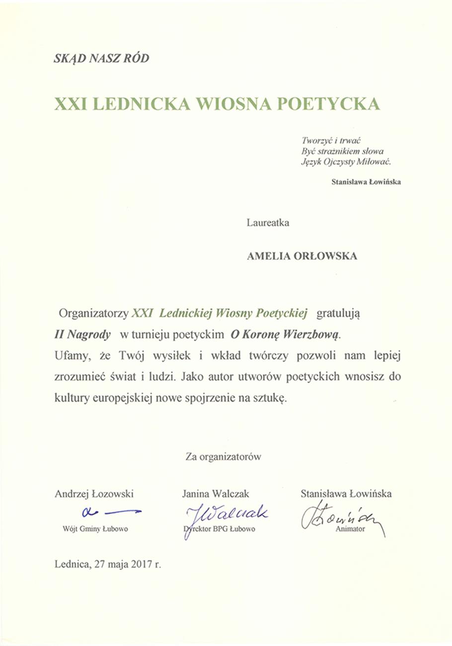 27 maja 2017 r., w Bibliotece Publicznej Gminy Łubowo oraz na terenie Muzeum Pierwszych Piastów na Lednicy, odbył się finał XXI Lednickiej Wiosny Poetyckiej, objęty honorowym patronatem Wielkopolskiego Kuratora Oświaty.