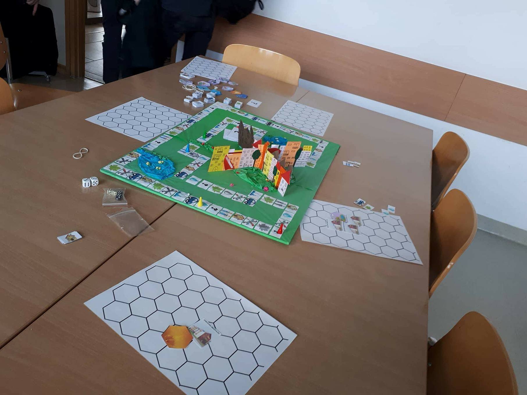 Później równolegle odbywały się sesje warsztatowe w grupach. Podzielona na mniejsze zespoły klasa miała możliwość brać udział w zajęciach takich jak: „Analiza wielokryterialna – uwarunkowania środowiskowe lokalizacji składowiska” oraz „Internetowe źródła mapowe w zarządzaniu środowiskiem”. Były to zadania komputerowe przy użyciu narzędzi GIS, które wywarły na nas bardzo pozytywne wrażenie. Ponadto odbyła się również pobudzająca naszą kreatywność gra planszowa: „ Zaplanuj ekologiczne miasto” oraz wykład „Od nadmiernej konsumpcji do zrównoważonego rozwoju”.