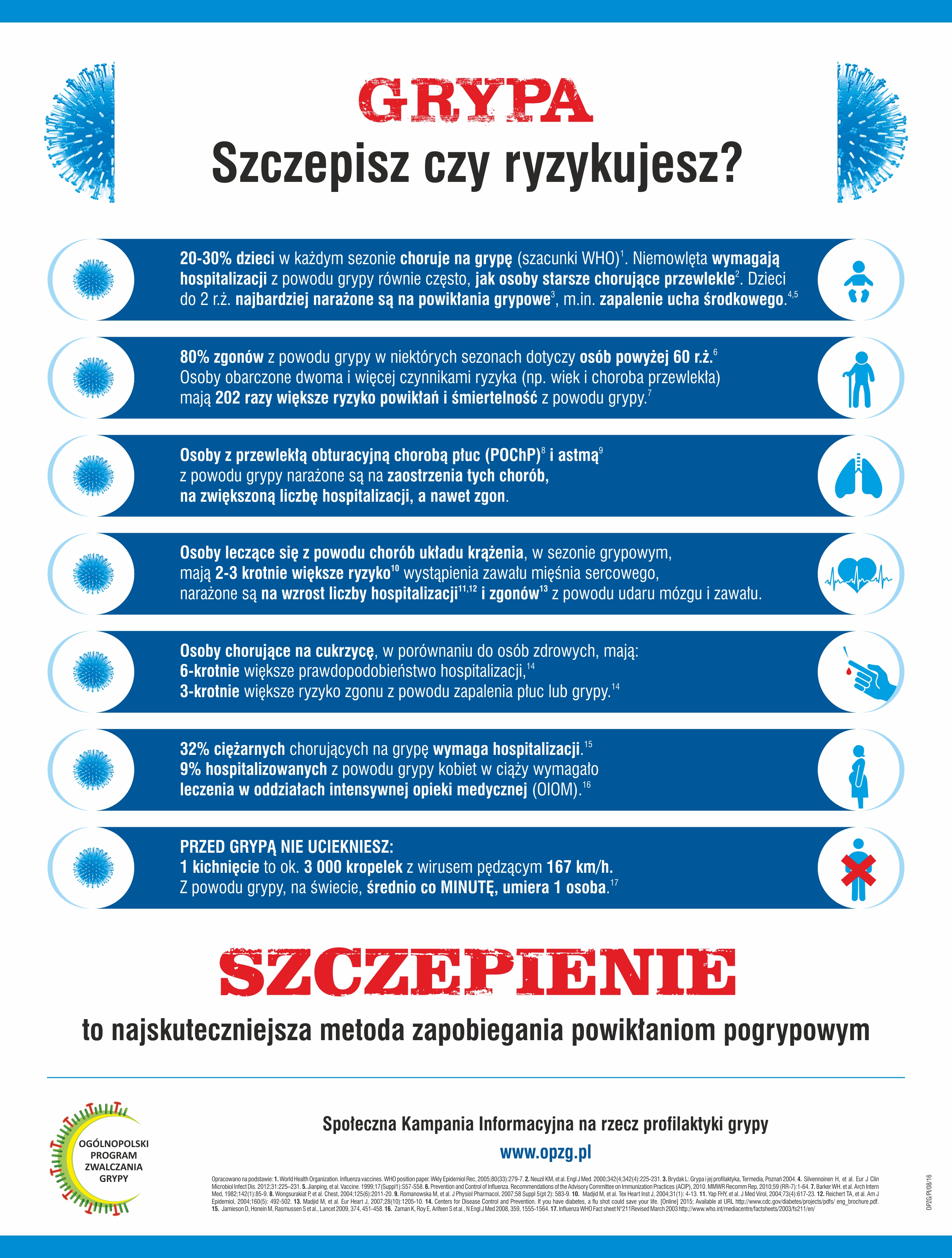 W związku z trwającym sezonem zachorowań na grypę w Polsce, Państwowy Powiatowy Inspektor Sanitarny w Poznaniu przekazuje przygotowane w ramach Ogólnopolskiego Programu Zwalczania Grypy (OPZG) i w ramach akcji „Zaszczep się wiedzą” materiały informacyjno-edukacyjne do wykorzystania w działaniach informacyjnych w wersji elektronicznej.