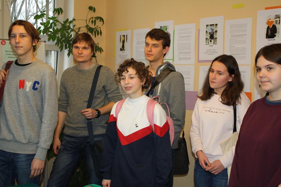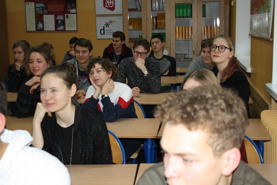 Szkolna część projektu składała się z prezentacji i rozmów z migrantami, wystawy i quizu w bibliotece. ?W spotkaniach wzięli udział migranci z Syrii, Afganistanu, Grecji i byłej Jugosławii żyjący obecnie w Niemczech oraz 33 uczniów VII LO i 12 uczniów z nauczycielami z IX LO. [PB]