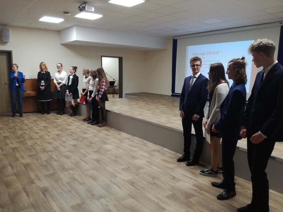 Pani Małgorzata Kraśnik wyjaśniła, co to jest nauczanie dwujęzyczne i na czym ono polega, zapoznała zainteresowanych z wymaganiami, warunkami przyjęcia do klasy dwujęzycznej oraz jej funkcjonowaniem. Nasi reprezentanci opowiadali o korzyściach płynących z nauczania dwujęzycznego oraz własnych doświadczeniach związanych z wyborem klasy dwujęzycznej.