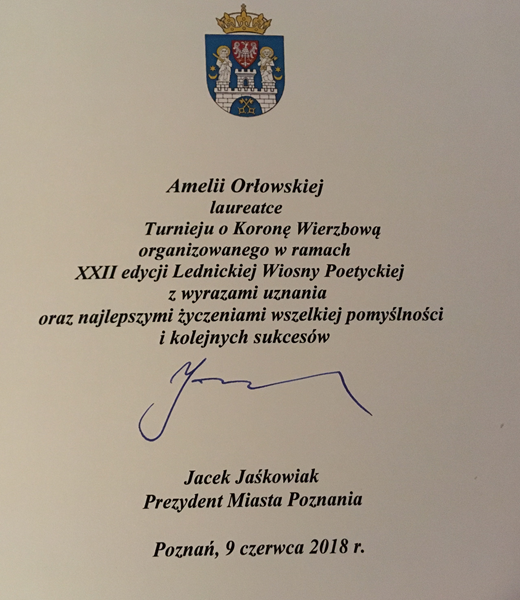Tytuł laureatki Turnieju o Koronę Wierzbową Lednickiej Wiosny Poetyckiej dla Amelii Orłowskiej to wielki sukces. Amelia otrzymała list gratulacyjny od Prezydenta Miasta Poznania pana Jacka Jaśkowiaka. Poetka udzieliła też kilku wywiadów!