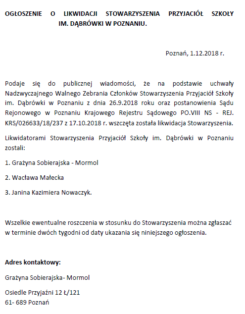 Ogłoszenie o likwidacji Stowarzyszenia Przyjaciół Szkoły