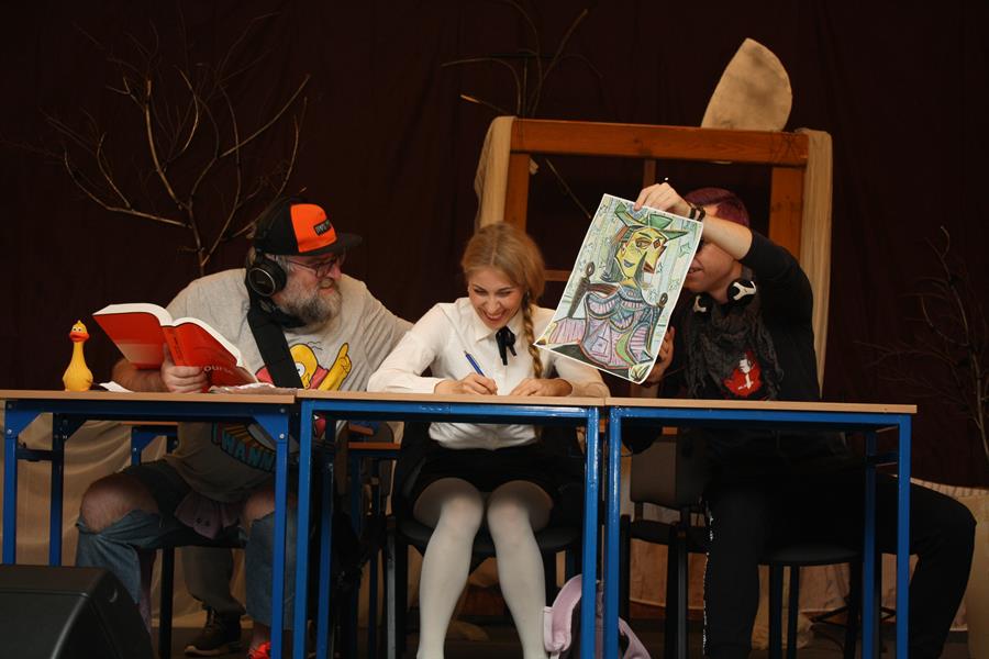 Koncept owej swoistej tragikomedii oparty był na motywie sobowtóra. Każdy nauczyciel wcielił się w dwie postaci: głosem [odtwarzanym z nagrania] był sobą prowadzącym lekcje, a na scenie odgrywał rolę ucznia. Te dwie postaci wchodziły w ciekawe interakcje, z czego wynikała brawurowa intryga i swoiste qui pro quo.