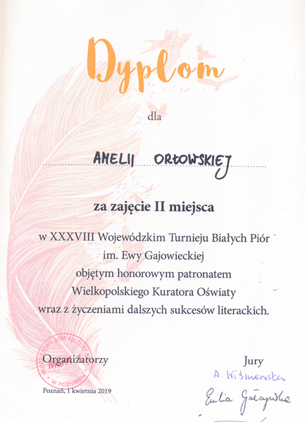 Uczestniczyło w nim czterystu dziesięciu uczniów ze szkół województwa wielkopolskiego w kategoriach prozy i poezji. Gratulujemy Amelii Orłowskiej zdobycia II miejsca.