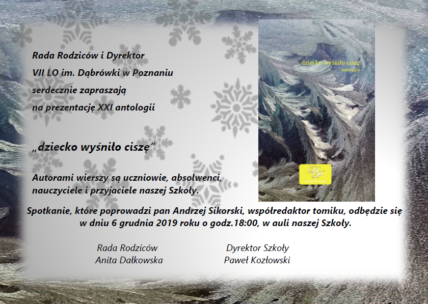 Mamy zaszczyt zaprosić na spotkanie promocyjne XXI antologii bożonarodzeniowej "dziecko wyśniło ciszę": 6 grudnia o godzinie 18.00 w Auli VII Liceum Ogólnokształcącego im. Dąbrówki.