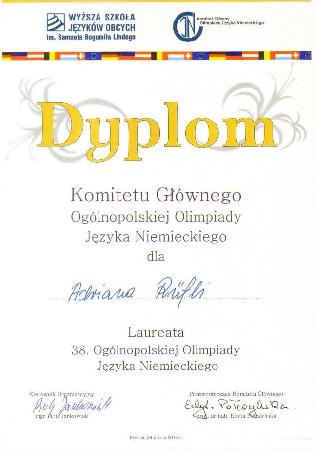 Adrian Rüfli, uczeń klasy III E VII Liceum Ogólnokształcącego im. Dąbrówki 29 marca 2015 r. uzyskał tytuł Laureata 38 Olimpiady Języka Niemieckiego.